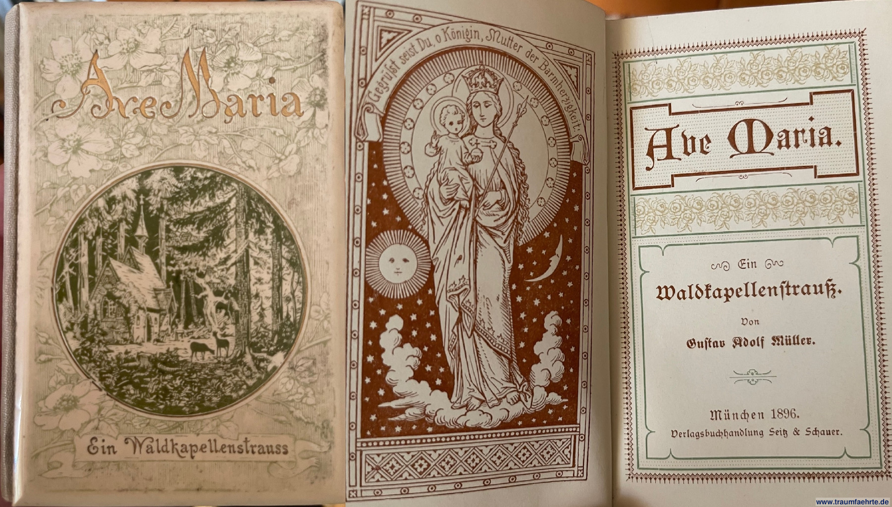 Alte Bücher etc. > Belletristik > Gedichte & DramenMüller, Gustav Adolf: Ave Maria. Ein Waldkapellenstrauß. [ Permalink ]>>> Artikel-Nr: 25981 <<< München, Seitz & Schauer 1896, mit 1 Titelbild, 64 S., 1 Blatt Verlagswerbung, illustr. OLn., Vorderdeckel mit Emaille-Optik, 8,5 x 12 cm Zustand: schönes Exemplar Preis: 48,00 €