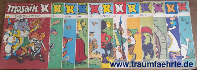 Alte Bücher etc. > Kinderbücher > Comics & HumorMosaik-Bilderzeitschrift (Abrafaxe) 1979, Hefte 1–12 (kompletter Jahrgang) [ Permalink ]>>> Artikel-Nr: 26110 <<< Berlin, Verlag Junge Welt 1979, mit farb. Bildern, je Heft 19 S., farb. illustr. OBro. Zustand: ordentliche Hefte Preis: 14,00 €