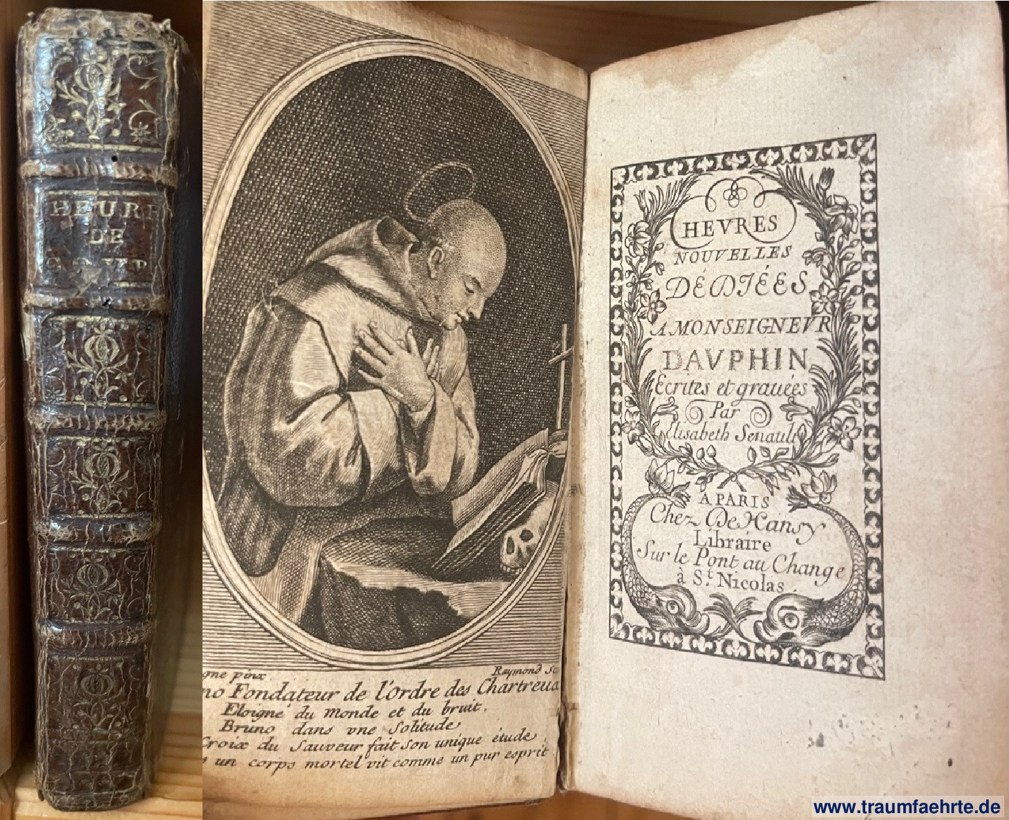 Alte Bücher etc. > Religion > Bibelausgaben & GesangbücherSenault, Elisabeth: Heures nouvelles dediees a Monseignur Dauphin. [ Permalink ]>>> Artikel-Nr: 26544 <<< Paris, C. de Hansy (ca. 1690), mit 1 Titelkupfer, gestochenem Frontispiz, alle 212 Seiten gestochen (Kupferstiche), tlw. kalligraphische Textanfänge (französischer Text), goldgeprägtes OLdr., 8,5 x 12,5 cm, verblasster Dreiseiten-Goldschnitt Zustand: 2 Exlibris (eines aus der Bibliothek des Comte de Broqua), schiefgelesen, Einband berieben, Seiten tlw. braunfleckig Preis: 580,00 €