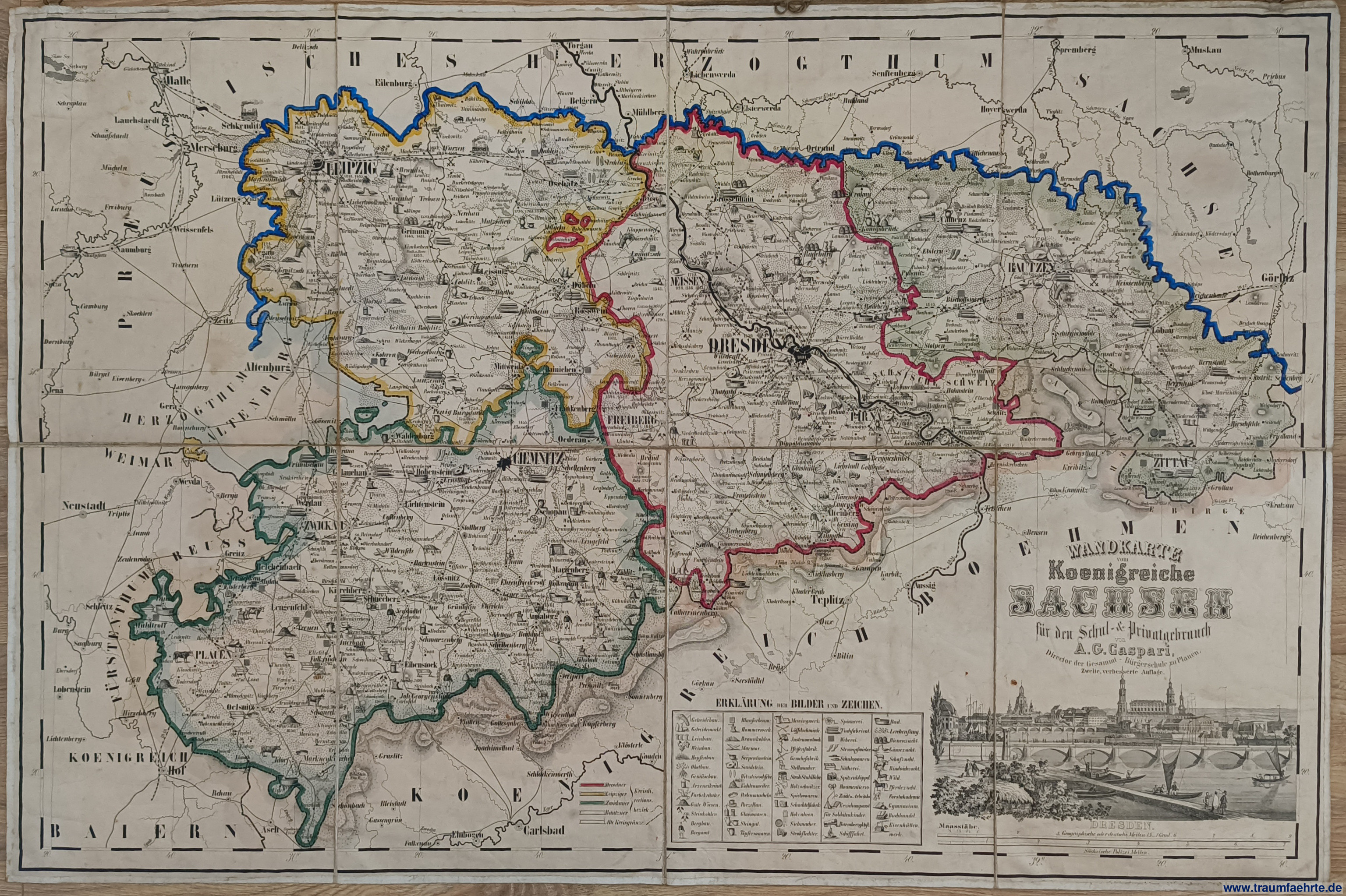 Alte Bücher etc. > SachsenCaspari, Adolph Gustav (Pädagoge und Schuldirektor in Plauen / Vogtland): Wandkarte vom Königreiche Sachsen für den Schul- und Privatgebrauch. [ Permalink ]>>> Artikel-Nr: 29164 <<< ca. 1870, randkolorierte, lithogr. Karte (117 x 78 cm) auf Leinen aufgezogen, mehrfach gefalten, mit schöner Stadtansicht von Dresden in rechter Ecke, mit Symbolen und Zeichen von Handwerk, Industrie und Handel an den jeweiligen Standorten Zustand: die seltene Karte ist gering gebräunt, zwei vereinzelte kleine Flecken, insgesamt schönes Exemplar, das alte Aufhängungsseil für den Schulgebrauch ist noch vorhanden Preis: 2.400,00 €