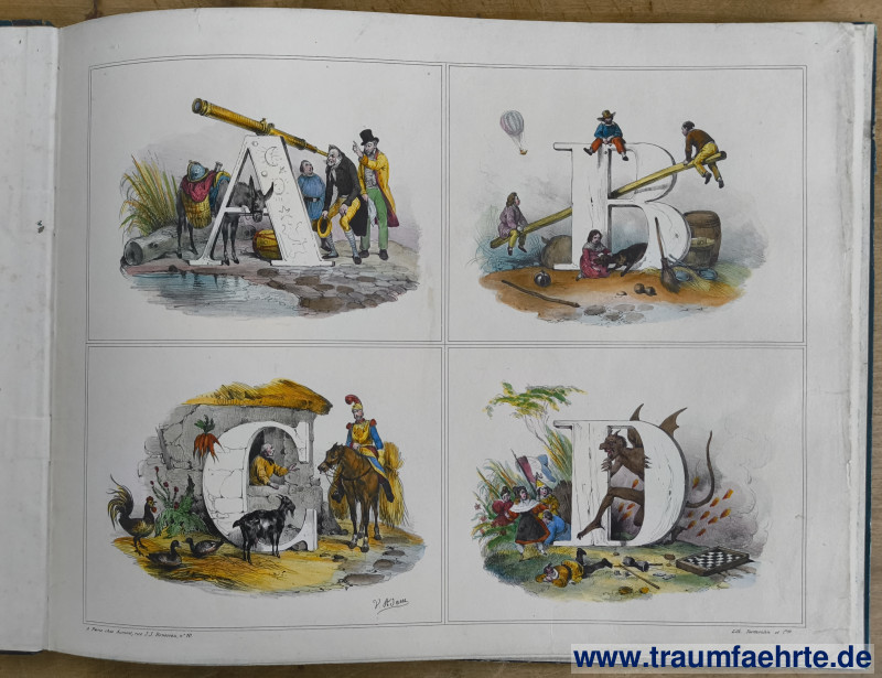 Alte Bücher etc. > Kinderbücher > Fibeln & LehrbücherABC-Bilderbuch. [ Permalink ]>>> Artikel-Nr: 29678 <<< Paris ca. 1850, 10 lithogr. Tafeln mit dem ABC und Zahlen von 1–10 (immer 4 auf einem Blatt), Buchstaben, Zahlen jeweils passend mit Szenen illustriert und handcoloriert, 1 Blatt französischer Text, OHLdr., Quer-Folio Zustand: Einband, Einbandkanten berieben Preis: 1.850,00 €