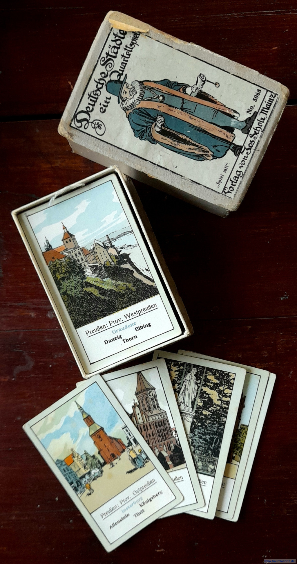 Alte Bücher etc. > Spielkarten & Spiele > VerschiedenesDeutsche Städte. Ein Quartettspiel. [ Permalink ]>>> Artikel-Nr: 29956 <<< Mainz, Scholz ca. 1910 (= ‘Spiel mit’), Nr. 5068, komplettes Spiel mit 96 Spielkarten (farb. Städte-Abbildungen, auch Ostgebiete), mit Spielanleitung – alles in farb. illustr. Orig.-Pappschachtel Zustand: 3 Karten mit Tesa geklebt, Schachtel berieben Preis: 75,00 €