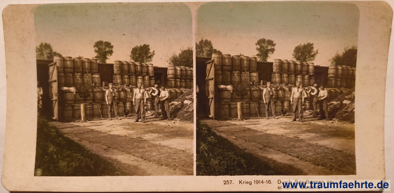 handkolorierte Stereofotografie / Raumbild – Neue Photographische Gesellschaft (NPG), Serie zum Ersten Weltkrieg, Nr. 257: Soldaten vor Mauer mit Fässern und Tor, Wiese im Vordergrund, Bäume im Hintergrund