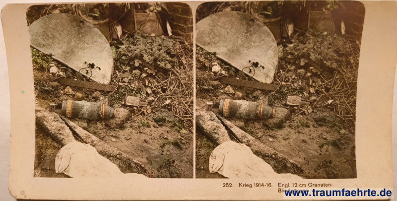 handkolorierte Stereofotografie / Raumbild – Neue Photographische Gesellschaft (NPG), Serie zum Ersten Weltkrieg, Nr. 252: Granate auf dem Boden