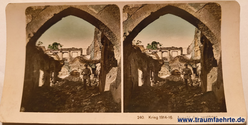 Schlagworte: Stereophotographie, Neue Photographische Gesellschaft, Erster Weltkrieg, Fotografie, Propaganda, Klöster, Ruinen, Zerstörungen, Soldaten, Torbögen