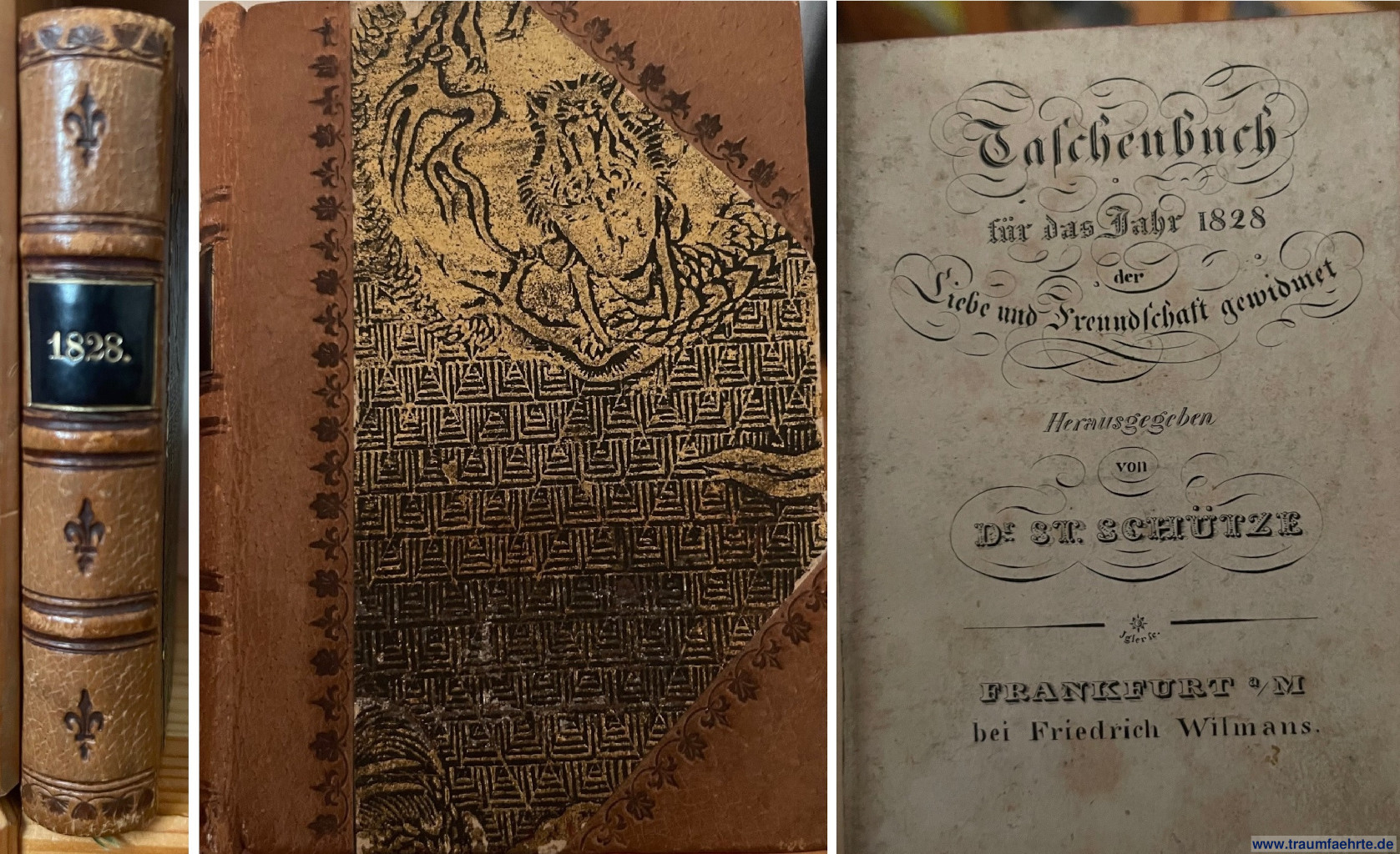 Alte Bücher etc. > VerschiedenesSchütze, St. (Hrsg.): Taschenbuch für das Jahr 1828 der Liebe und Freundschaft gewidmet. [ Permalink ]>>> Artikel-Nr: 30156 <<< Frankfurt, Wilmans (1827), mit 12 Stahstichen, 325 S., späterer Halblederband mit Lederecken (Handeinband, 3 falschen Bünden, Klein-8° Zustand: Einband etwas berieben Preis: 90,00 €