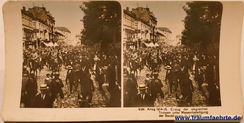 hand-colorized stereoscopic photograph / stereoview – Neue Photographische Gesellschaft (NPG), series on World War I, no. 229: soldiers in uniform ride on horses across the street, surrounded by crowds of pedestrians; houses, wall, and tree in the background; reference object in the German Federal Archives, Bild 146-2006-0158: Link.