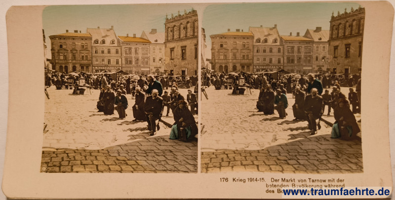 hand-colorized stereoscopic photograph / stereoview – Neue Photographische Gesellschaft (NPG), series on World War I, no. 176: market square with kneeling pedestrians, houses in the background, wall of town square to the right