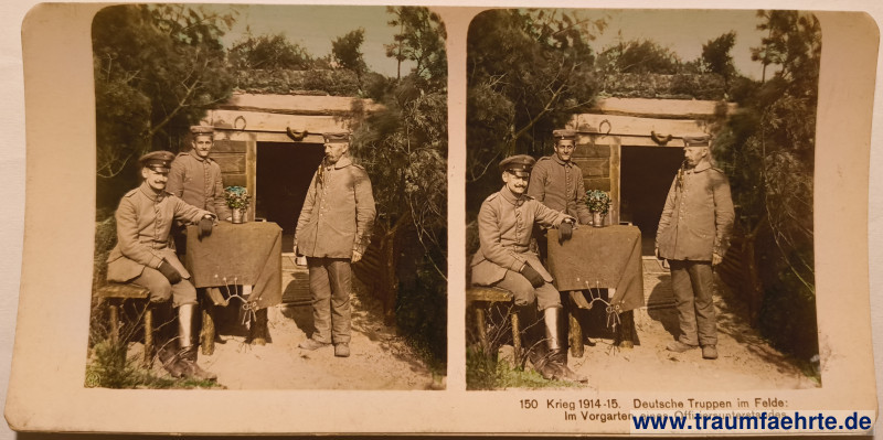 hand-colorized stereoscopic photograph / stereoview – Neue Photographische Gesellschaft (NPG), series on World War I, no. 150: soldiers in uniform at a table with a bouquet in front of a shelter