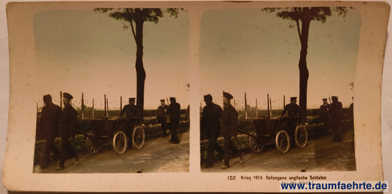 Keywords: Stereophotography, Neue Photographische Gesellschaft, World War I, Photography, Propaganda, Soldiers, Prisoners of War, Handcarts, Rifles, Militaria