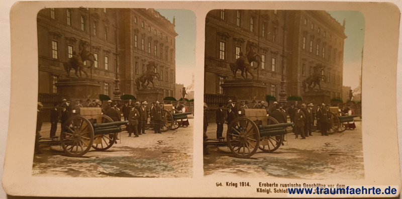 Schlagworte: Stereophotographie, Neue Photographische Gesellschaft, Erster Weltkrieg, Fotografie, Propaganda, Kanonen, Soldaten, Reiterstatuen, Schlösser, Militaria