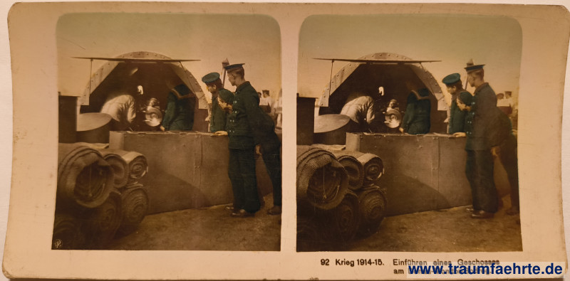 handkolorierte Stereofotografie / Raumbild – Neue Photographische Gesellschaft (NPG), Serie zum Ersten Weltkrieg, Nr. 92: Matrosen in Uniform beladen eine Schiffskanone