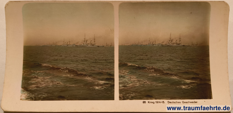handkolorierte Stereofotografie / Raumbild – Neue Photographische Gesellschaft (NPG), Serie zum Ersten Weltkrieg, Nr. 85: Kriegsschiffe auf hoher See