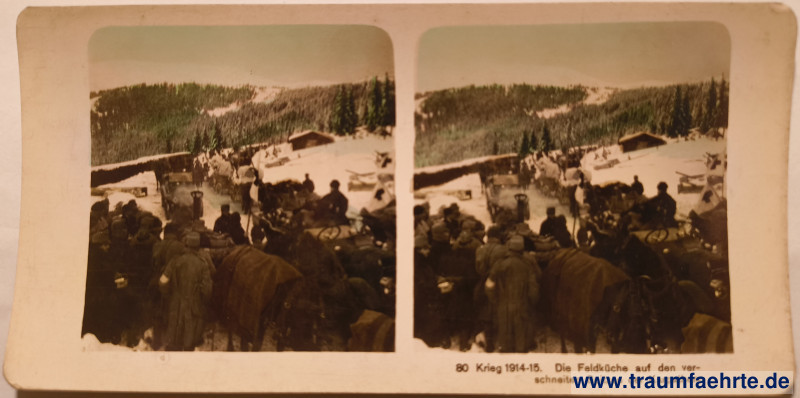 handkolorierte Stereofotografie / Raumbild – Neue Photographische Gesellschaft (NPG), Serie zum Ersten Weltkrieg, Nr. 80: Feldküche, Autos, Kutschen Soldaten in den verschneiten Karpaten, Flaggen mit Rotem Kreuz, Hütte und bewaldeter Berghang im Hintergrund