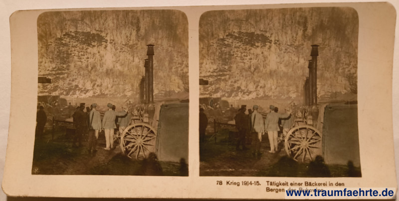 handkolorierte Stereofotografie / Raumbild – Neue Photographische Gesellschaft (NPG), Serie zum Ersten Weltkrieg, Nr. 78: Soldaten in Uniform, Feldküchen auf Rädern, Felswand im Hintergrund