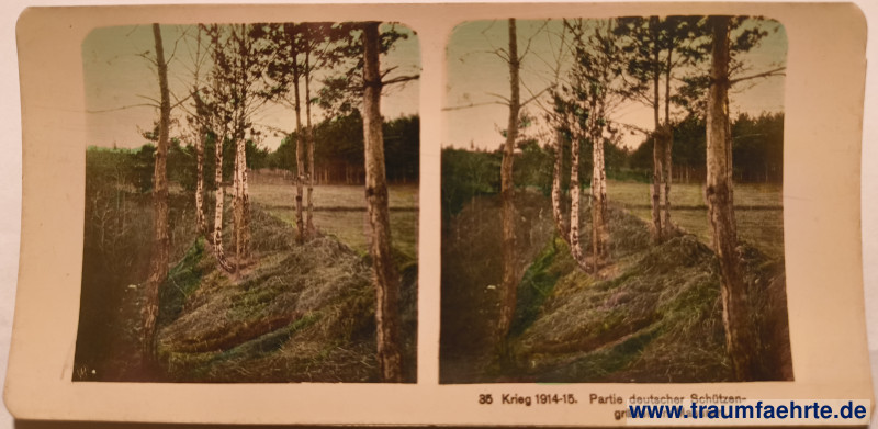 handkolorierte Stereofotografie / Raumbild – Neue Photographische Gesellschaft (NPG), Serie zum Ersten Weltkrieg, Nr. 35: Schützengraben, Birken und andere Bäume, Wiese und Wald im Hintergrund