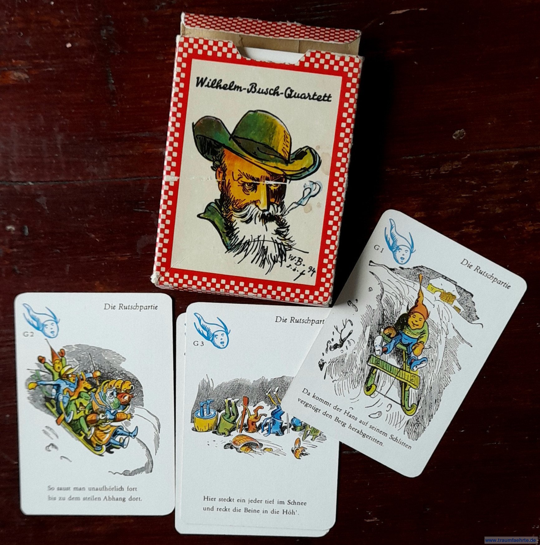 Alte Bücher etc. > Kinderbücher > Spielkarten & SpieleZoche, Peter: Wilhelm-Busch-Quartett. [ Permalink ]>>> Artikel-Nr: 30737 <<< Pössneck, Forkel 1971, 32 Spielkarten mit farb. Bildern von Wilhelm Busch, in farb. illustr. Orig.-Schachtel Zustand: Schachtelvorderdeckel mit Abrieb Preis: 10,00 €