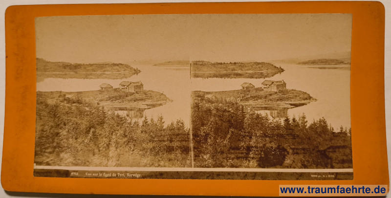 stereoscopic photograph / stereoview – peninsula or island with single houses on the fjord, shore with reflection in the water, trees in front, islands with hills and forest in the background