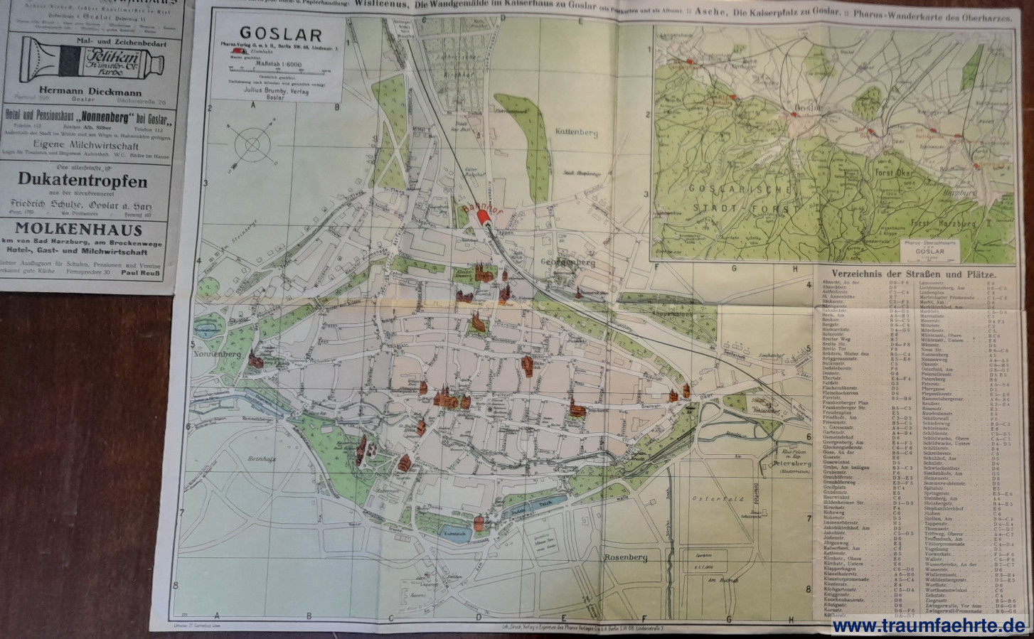 Alte Bücher etc. > Landkarten > Stadtpläne & Atlanten DeutschlandPharus-Plan Goslar. [ Permalink ]>>> Artikel-Nr: 31468 <<< Goslar, Brumby ca. 1930, Maßstab 1:6000, ausklappbare, farb. Plan (52x40 cm) inOrig.-Umschlag Zustand: Umschlag etwas angerändert Preis: 28,00 €