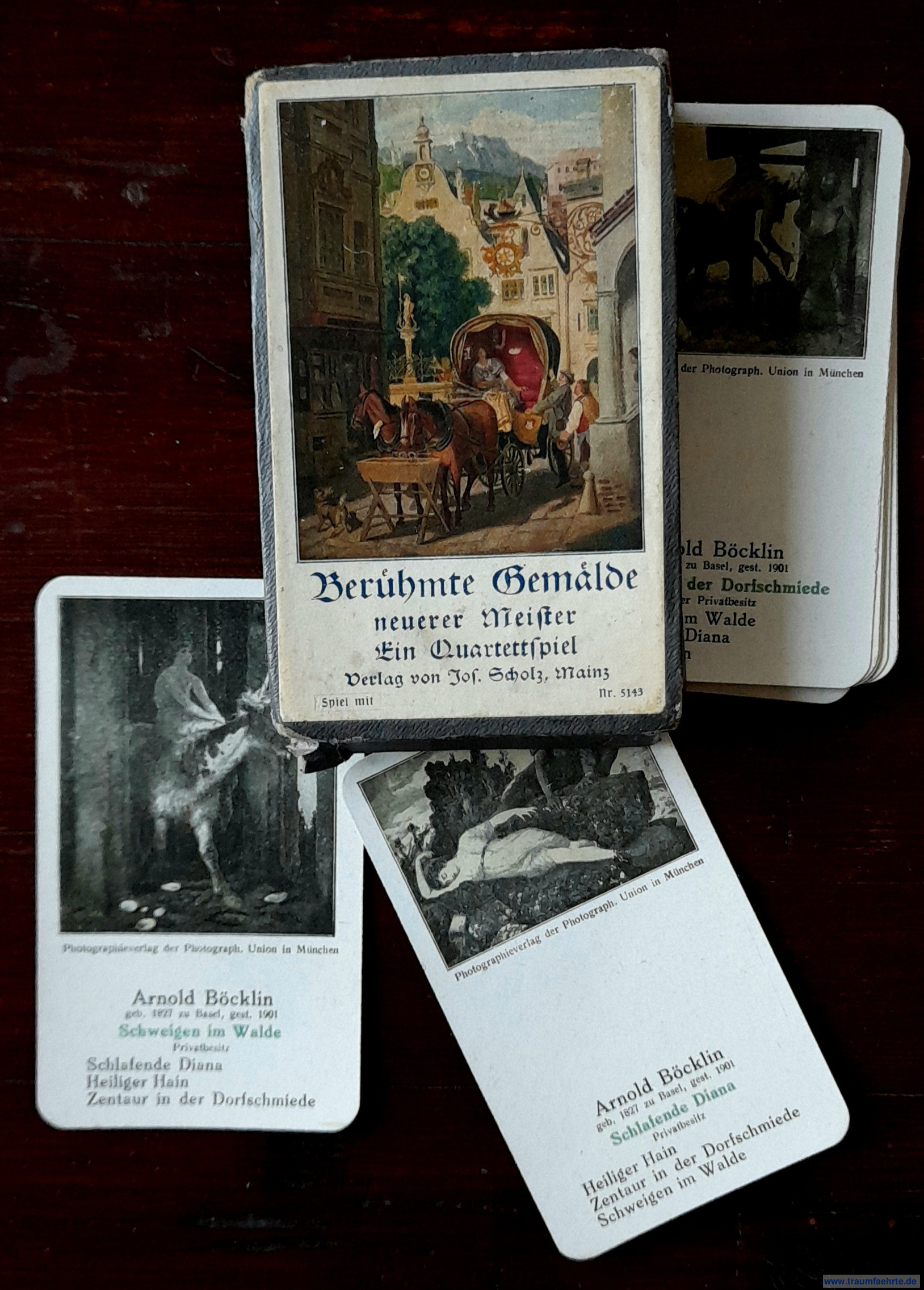 Alte Bücher etc. > Kinderbücher > Spielkarten & SpieleBerühmte Gemälde neuerer Meister. Ein Quartettspiel. [ Permalink ]>>> Artikel-Nr: 31941 <<< Mainz, Scholz ca. 1925 (= Scholz' künstlerische Spiele Nr. 5143), 12 Quartette (so komplett), mit Spielanleitung in farb. Illustr. Orig.-Schachtel Zustand: Schachtel angeplatzt Preis: 35,00 €