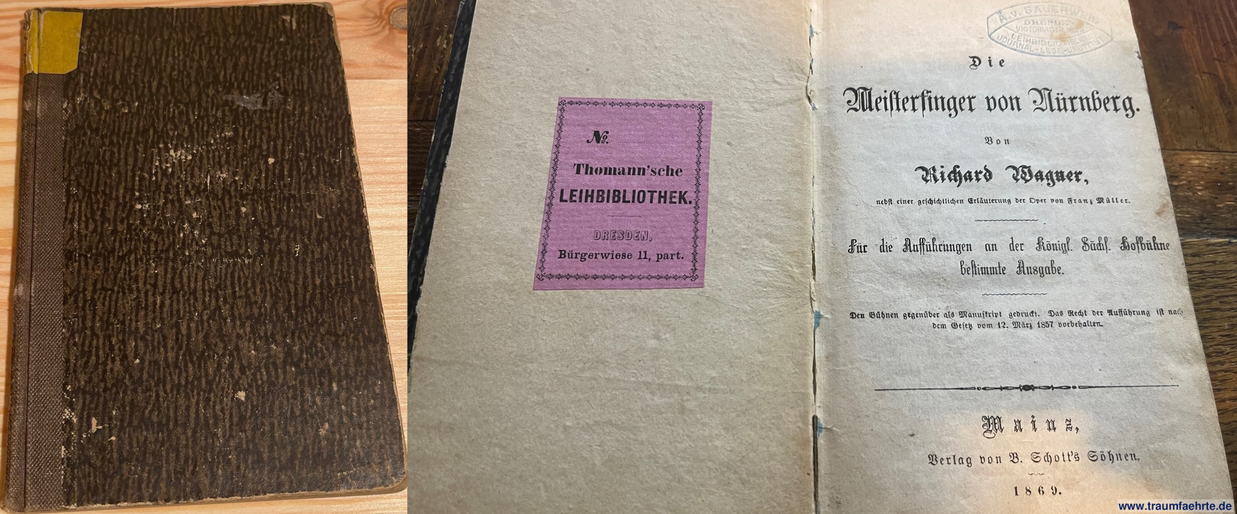 Alte Bücher etc. > Musik > Liederbücher & OperntexteWagner, Richard: Die Meistersinger von Nürnberg. Für die Aufführungen an der königl. Sächs. Hofbühne (Dresden) bestimmte Ausgabe. [ Permalink ]>>> Artikel-Nr: 32152 <<< Mainz, Schott 1869, 101 S., 3 Blatt Verlagswerbung, Halbleinenband der Zeit (ehemaliges Exemplar der Thomannschen Leihbibliothek an der Bürgerwiese in Dresden) Zustand: Einbandkanten berieben Preis: 18,00 €