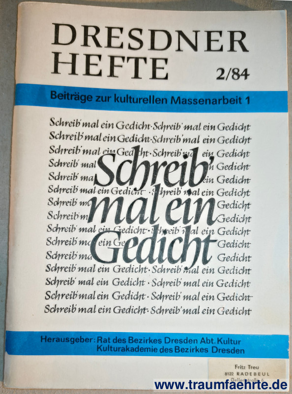Alte Bücher etc. > SachsenRat des Bezirkes Dresden (Hrsg.): Dresdner Hefte 2/84 (Beiträge zur kulturellen Massenarbeit 1). Schreib mal ein Gedicht. [ Permalink ]>>> Artikel-Nr: 32225 <<< Dresden, Rat des Bezirkes 1984, mit Abbildungen, 64 S., OBro. Zustand: kleiner Namenaufkleber auf Vorderdeckel, hinterer Umschlag mit leichter Knickspur Preis: 11,00 €