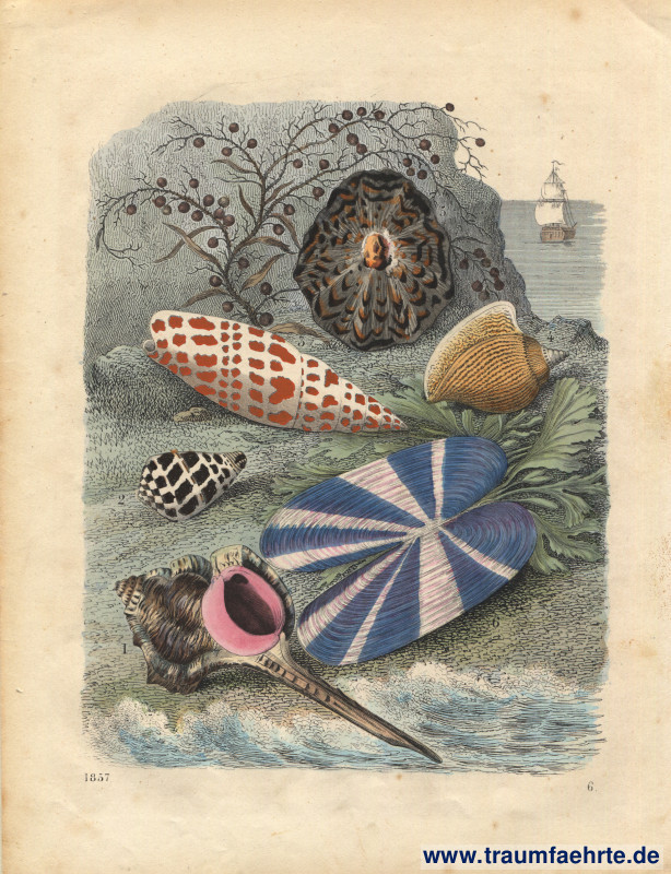 Original: kolorierte Lithographie – verschiedene Muschelarten am Ufer, Felsen, Meer mit Wellen, Segelschiff im Hintergrund
