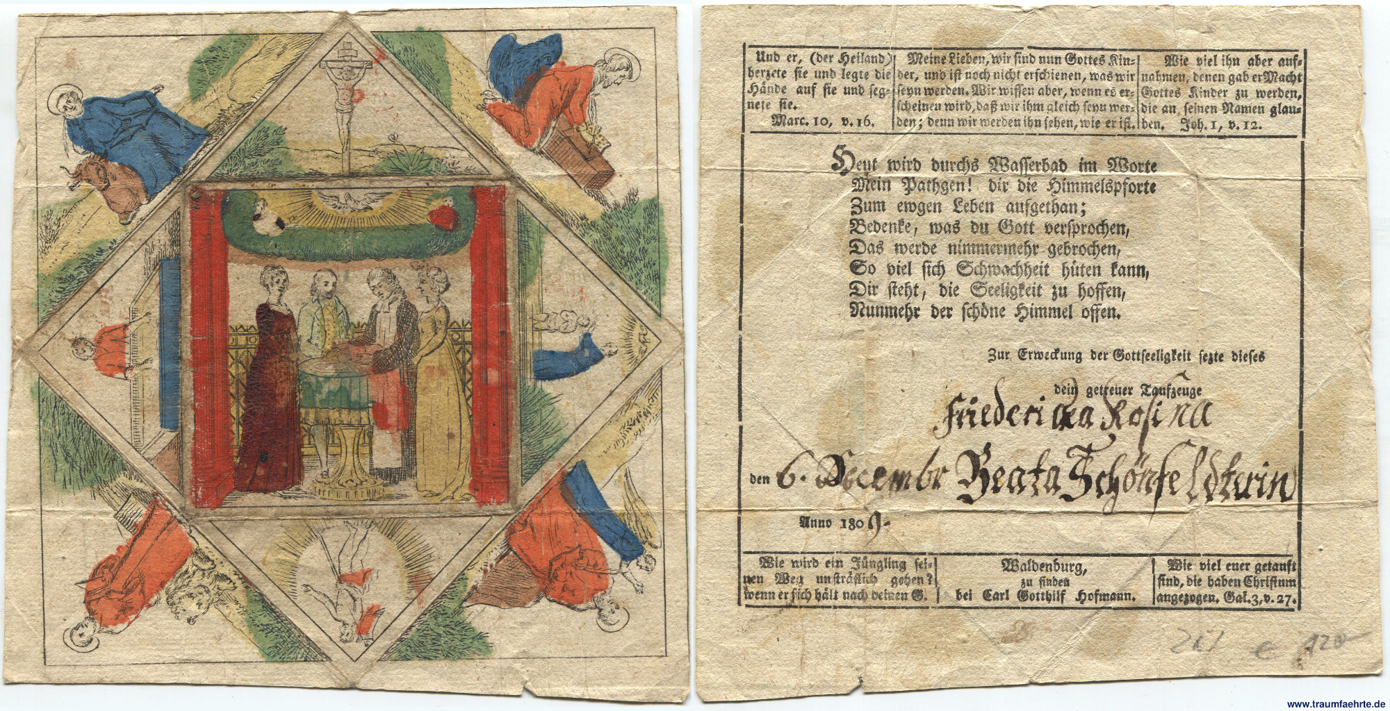 Alte Bücher etc. > Religion > ChristentumTaufbrief Anno 1809. [ Permalink ]>>> Artikel-Nr: 33355 <<< (ohne Ort) 1809, handcolorierter Kupferstich, rückseitig mit Bibelsprüchen und Tuscheeintragung des Tauftages (6. Dezember für Friederica Rosina Beata Schönfeldterin), ca. 16 x 16 cm Zustand: übliche Faltungen, kleine Löchlein an den Falzstellen Preis: 120,00 €