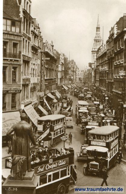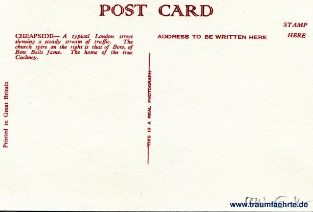 – Details – Jahr: ca. 1930 Status: ungelaufen Beschriftung vorne: Cheapside, London. Ind Coope's Ales, Sew by Electricity, Whiffin Beschriftung hinten: Post Card, Cheapside – A typical London street showing a steady stream of traffic. The church spire on the right is that of Bow, of Bow Bells fame. The home of the true Cockney. Address to be written here, Stamp here, This is a real photograph, Printed in Great Britain Stempel: keine Hinweis: