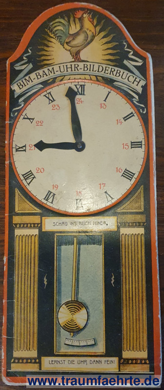 Alte Bücher etc. > Kinderbücher > Bilderbücher vor 1945Bim-Bam-Uhr-Bilderbuch (Schau ins Buch hinein, lernst die Uhr dann fein). [ Permalink ]>>> Artikel-Nr: 34131 <<< Anonym ca. 1925, dreifarb. Bilder (anonym), 6 Blatt, farb. Illustr. OKart. Mit Uhr und bewglichen Zeigern, 4° (12 x 30 cm) Zustand: Buchblock lose, Umschlag angerändert Preis: 75,00 €