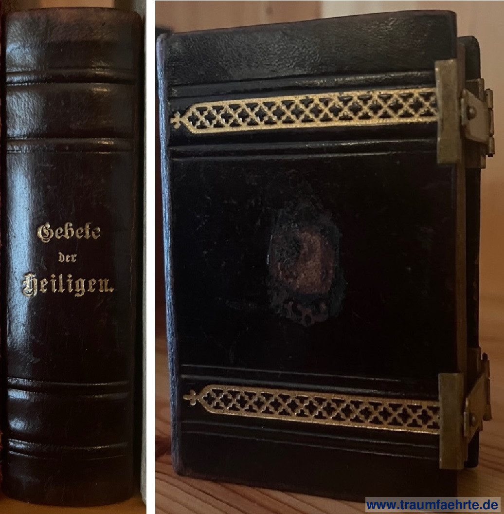 Alte Bücher etc. > Religion > ChristentumDie Gebete der Heiligen. Ein vollständiges katholisches Andachts- und Gebetbuch aus den Schriften der Heiligen. [ Permalink ]>>> Artikel-Nr: 34136 <<< Einsiedeln, Benziger ca. 1880, mit farb. (chromolithogr.) Doppeltitelbild, 468 S., 1 Blatt, goldgeprägter OLdr. mit zwei Metallschließen, Dreiseitengoldschnitt, 7 x 11cm Zustand: Einbandkanten berieben, Abriebstelle auf Vorderdeckel, Schließen sind tadellos Preis: 55,00 €