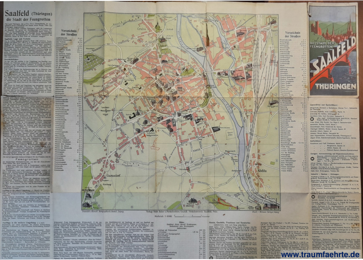 Alte Bücher etc. > Landkarten > Stadtpläne & Atlanten DeutschlandDie Stadt der Feengrotten Saalfeld/Thüringen (Stadtplan mit Straßenverzeichnis, rückseitig Umgebungskarte). [ Permalink ]>>> Artikel-Nr: 34182 <<< Leipzig, Kartographische Anstalt ca. 1930, ausklappbarer farb. Plan (66 x 50 cm), farb. Illustr. Deckelbild Zustand: Karte mit seitlichen Einrissen Preis: 9,00 €