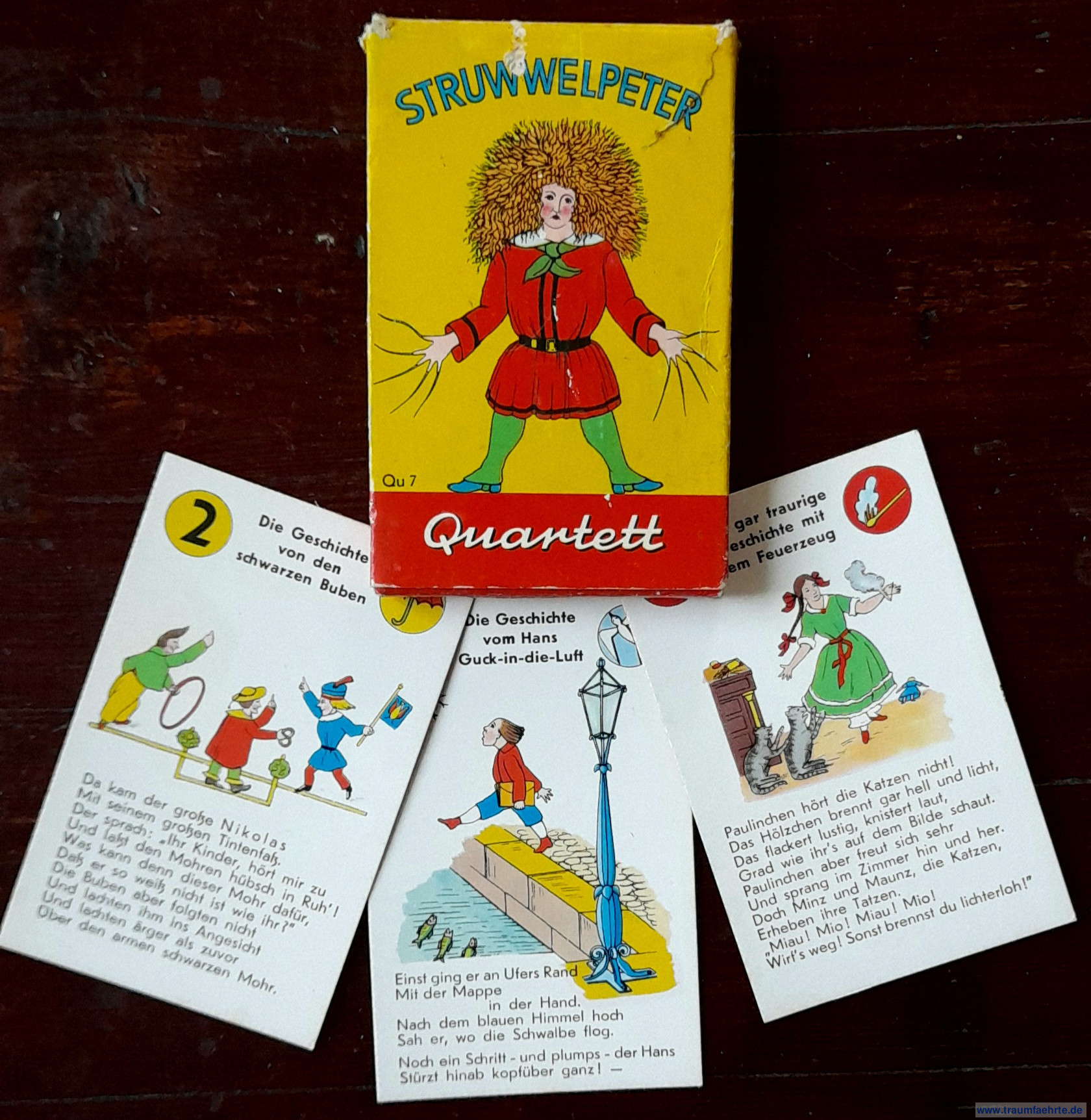 Alte Bücher etc. > Kinderbücher > Spielkarten & SpieleStruwwelpeter-Quartett. [ Permalink ]>>> Artikel-Nr: 34780 <<< Anonym, ca. 1965, 24 farb. Spielkarten, 1 Spielanleitung in farb. Illustr. Orig.-Schachtel Zustand: die Schachtel ist berieben und eingerissen, Karten tadellos Preis: 75,00 €