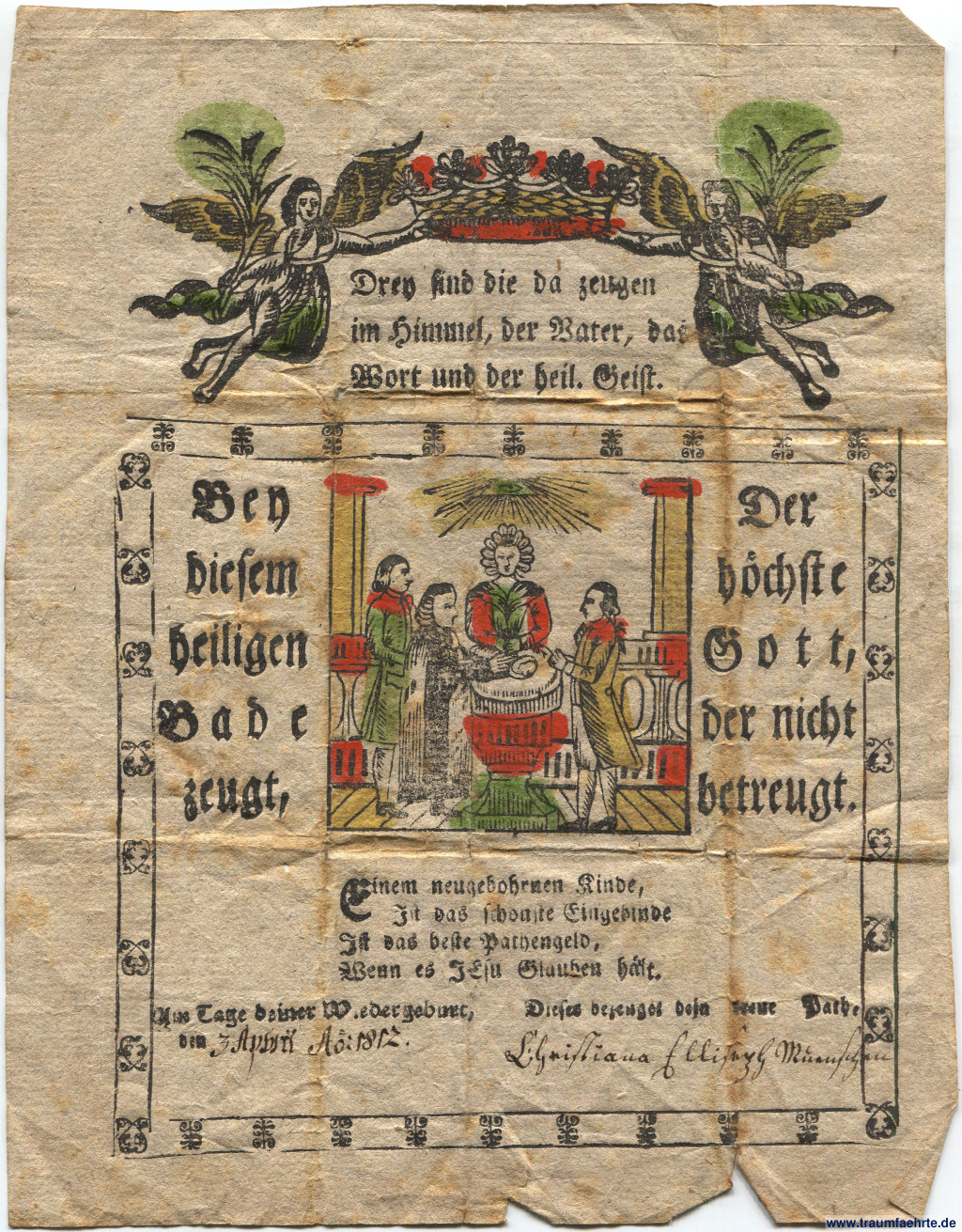 Alte Bücher etc. > Religion > ChristentumTaufbrief Anno 1812. [ Permalink ]>>> Artikel-Nr: 34787 <<< (ohne Ort) 1812, handcolorierter Kupferstich mit Bibelsprüchen und Tuscheeintragung des Tauftages, ca. 16 x 20 cm Zustand: übliche Faltungen, kleine Löcher, angerändert Preis: 100,00 €