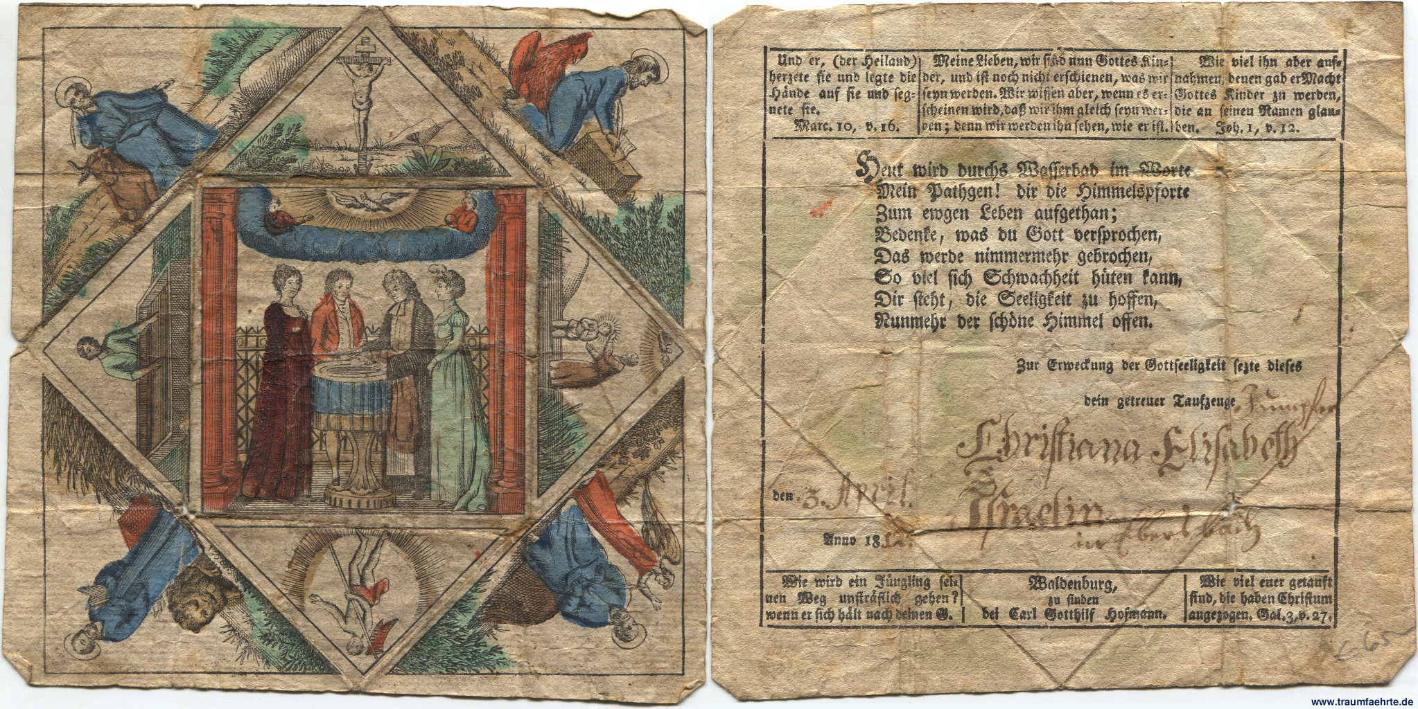 Alte Bücher etc. > Religion > ChristentumTaufbrief Anno 1812. [ Permalink ]>>> Artikel-Nr: 34789 <<< Ebersbach 1812, handcolorierter Kupferstich, rückseitig mit Bibelsprüchen und Tuscheeintragung des Tauftages, ca. 15 x 15 cm Zustand: übliche Faltungen, kleine Löcher, angerändert Preis: 65,00 €