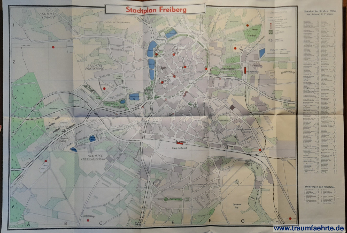 Alte Bücher etc. > SachsenStadtplan Freiberg. [ Permalink ]>>> Artikel-Nr: 35104 <<< Frankfurt, Dewag 1958, ausklappbarer, farb. Plan (59 x 41 cm), Maßstab: 1 : 8000, rückseitig Umgebungskarte und Werbung aufgedruckt Zustand: ordentliches Exemplar Preis: 25,00 €