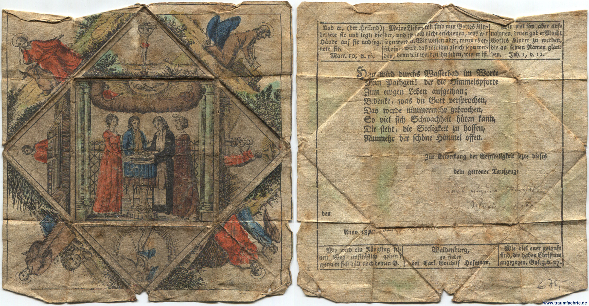 Alte Bücher etc. > Religion > ChristentumTaufbrief Anno 1810. [ Permalink ]>>> Artikel-Nr: 35570 <<< (ohne Ort) 1810, handcolorierter Kupferstich mit Bibelsprüchen und Tuscheeintragung des Tauftages, ca. 15 x 15 cm Zustand: übliche Faltungen, angestaubt Preis: 75,00 €