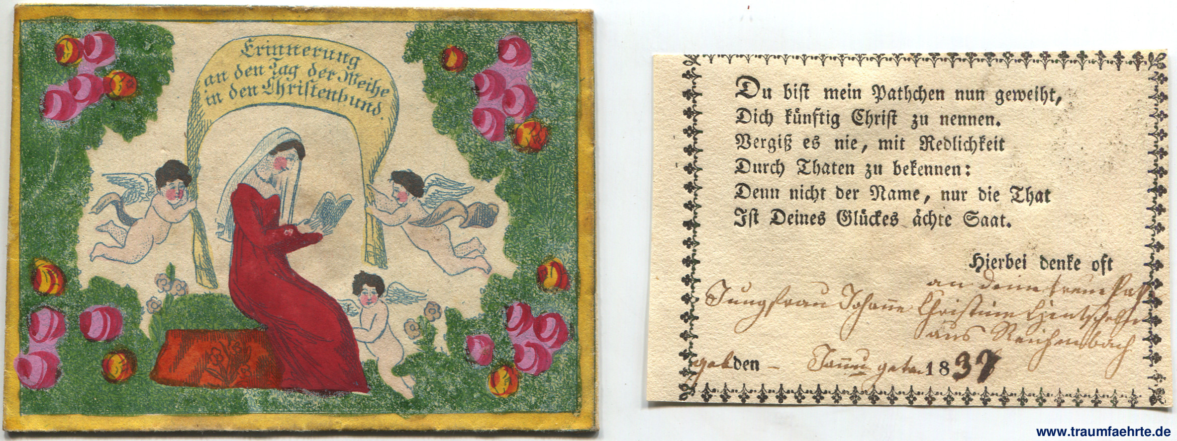 Alte Bücher etc. > Religion > ChristentumTaufbrief Anno 1837. [ Permalink ]>>> Artikel-Nr: 35573 <<< Reichenbach 1837, handcolorierter Kupferstich (betende Frau im Garten von 3 Engeln umflogen, mit Spruch: Erinnerung an den Tag der Weihe in den Christenbund), inliegend extra Zettel mit Bibelspruch und handschriftlichem Tauftag, als Brief gefalten (9 x 7,5 cm) Zustand: ordentliches Exemplar Preis: 60,00 €