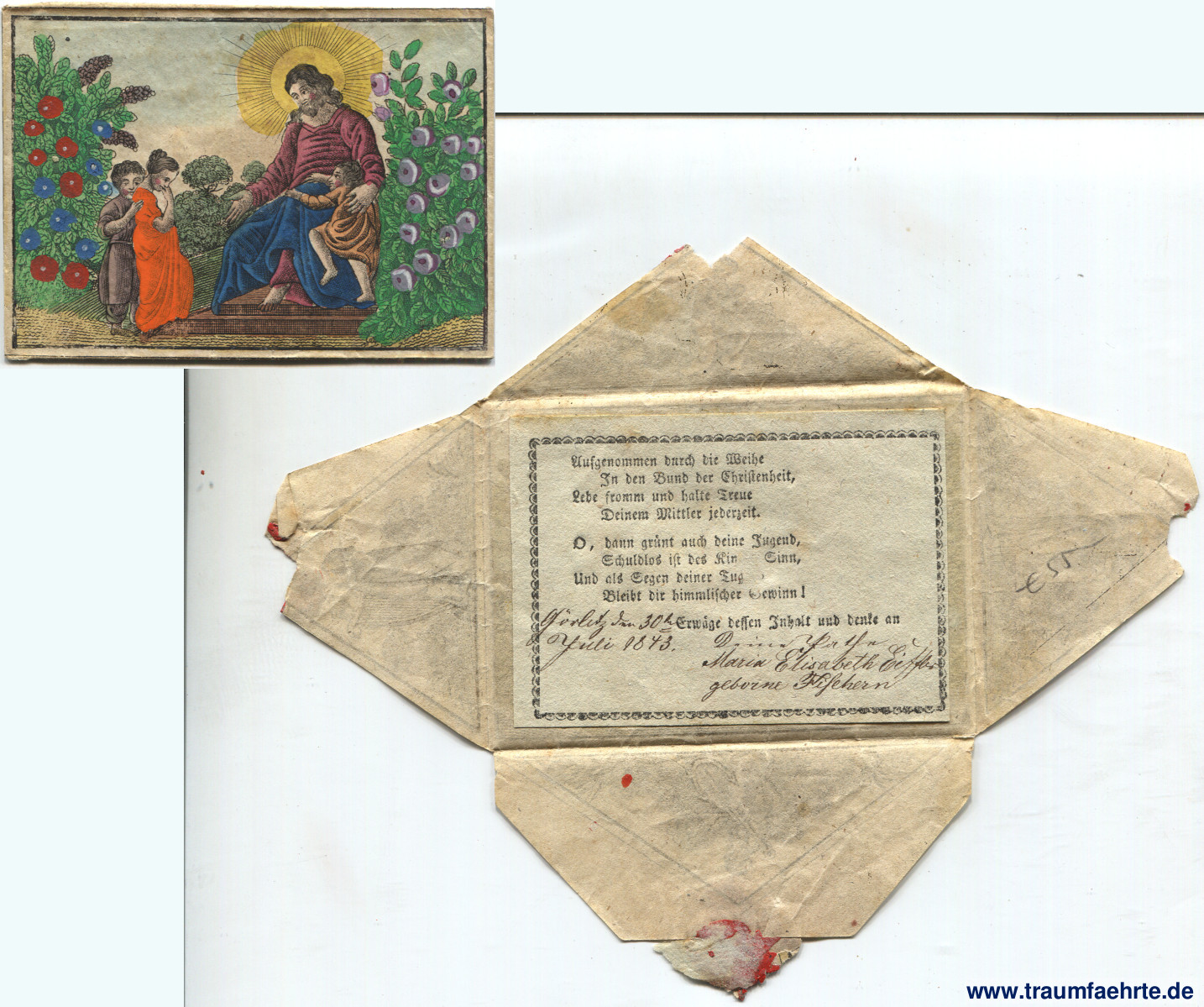 Alte Bücher etc. > Religion > ChristentumTaufbrief Anno 1843. [ Permalink ]>>> Artikel-Nr: 35577 <<< Görlitz 1843, handcolorierter Kupferstich (Christus mit 3 Kindern), inliegend extra Zettel mit Bibelspruch und handschriftlichem Tauftag, als Brief gefalten (9 x 7,5 cm) Zustand: ordentliches Exemplar Preis: 55,00 €