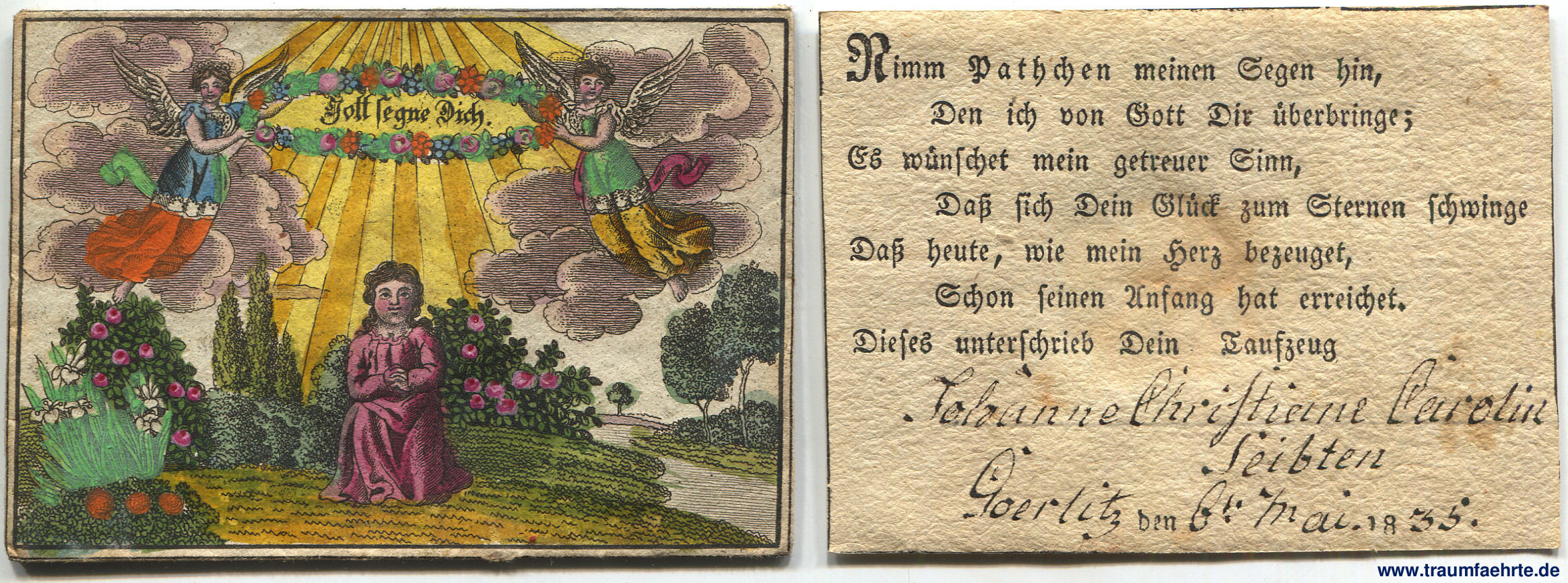 Alte Bücher etc. > Religion > ChristentumTaufbrief Anno 1835. [ Permalink ]>>> Artikel-Nr: 35580 <<< Görlitz 1835, handcolorierter Kupferstich (Zwei Engel über einem Kind; Spruch haltend: Gott segne Dich), inliegend extra Zettel mit Bibelspruch und handschriftlichem Tauftag, als Brief gefalten (9 x 7,5 cm) Zustand: ordentliches Exemplar Preis: 65,00 €
