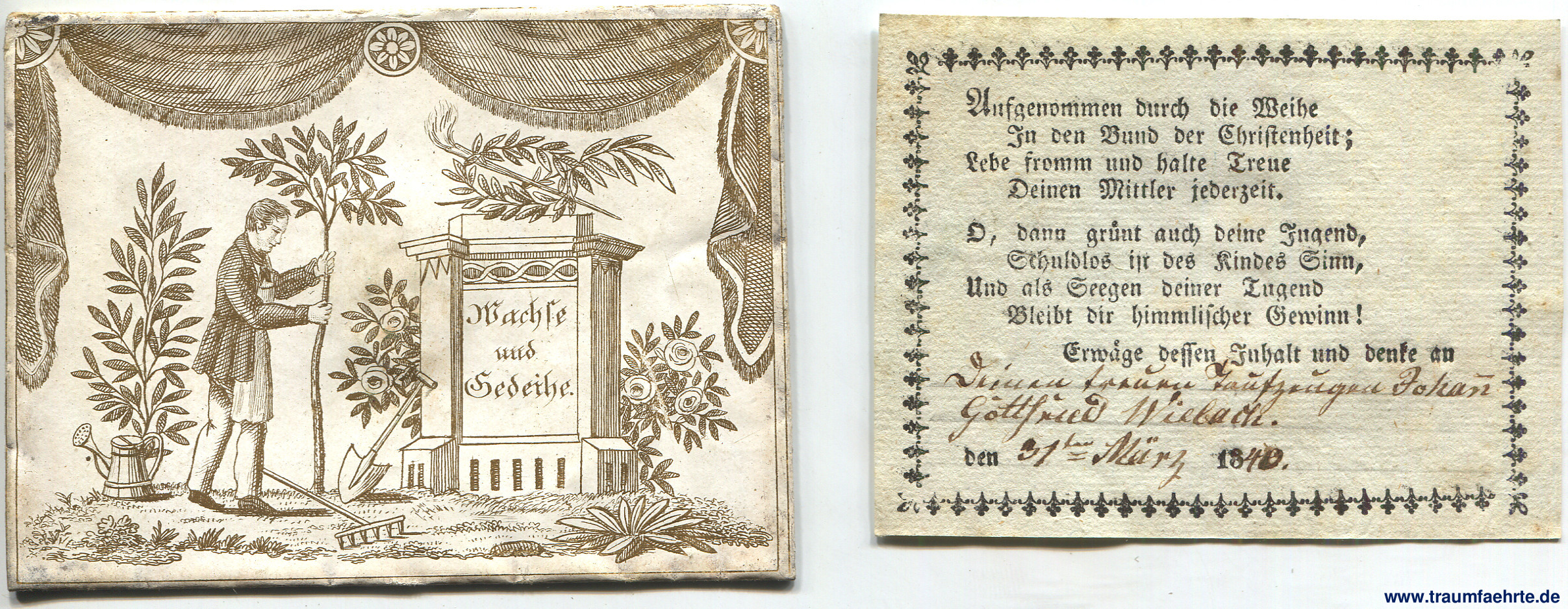 Alte Bücher etc. > Religion > ChristentumTaufbrief Anno 1840. [ Permalink ]>>> Artikel-Nr: 35591 <<< (wsl. Görlitz) 1840, Lithographie (Mann Baum pflanzend vor Gedenkstein mit Spruch: Wachse und gedeihe), inliegend extra Zettel mit Bibelspruch und handschriftlichem Tauftag, als Brief gefalten (9 x 7,5 cm) Zustand: ordentliches Exemplar Preis: 45,00 €
