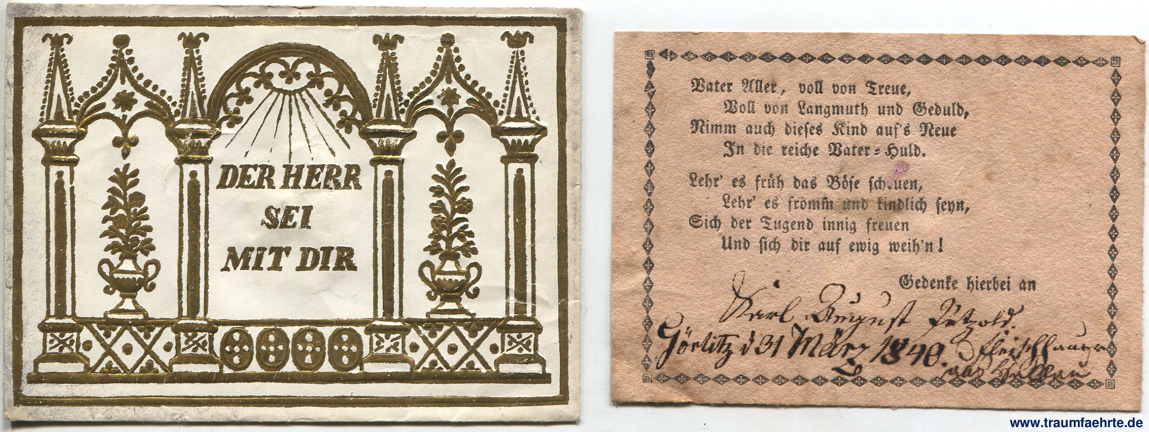 Alte Bücher etc. > Religion > ChristentumTaufbrief Anno 1840. [ Permalink ]>>> Artikel-Nr: 35594 <<< Görlitz 1840, Umschlag: goldgeprägter Säulengang mit Spruch: Der Herr sei mit Dir, inliegend extra Zettel mit Bibelspruch und handschriftlichem Tauftag, als Brief gefalten (9 x 7,5 cm) Zustand: ordentliches Exemplar Preis: 35,00 €
