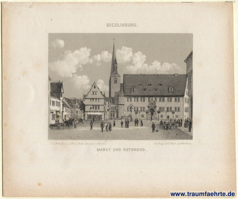 – Details – Jahr: ca. 1870 Beschriftung: Quedlinburg. Markt und Rathaus. N. d. Nat. gez. u. lith. v. Rob. Geissler, Berlin. Verlag v. H. C. Hueh, Quedlinburg. Hinweis: