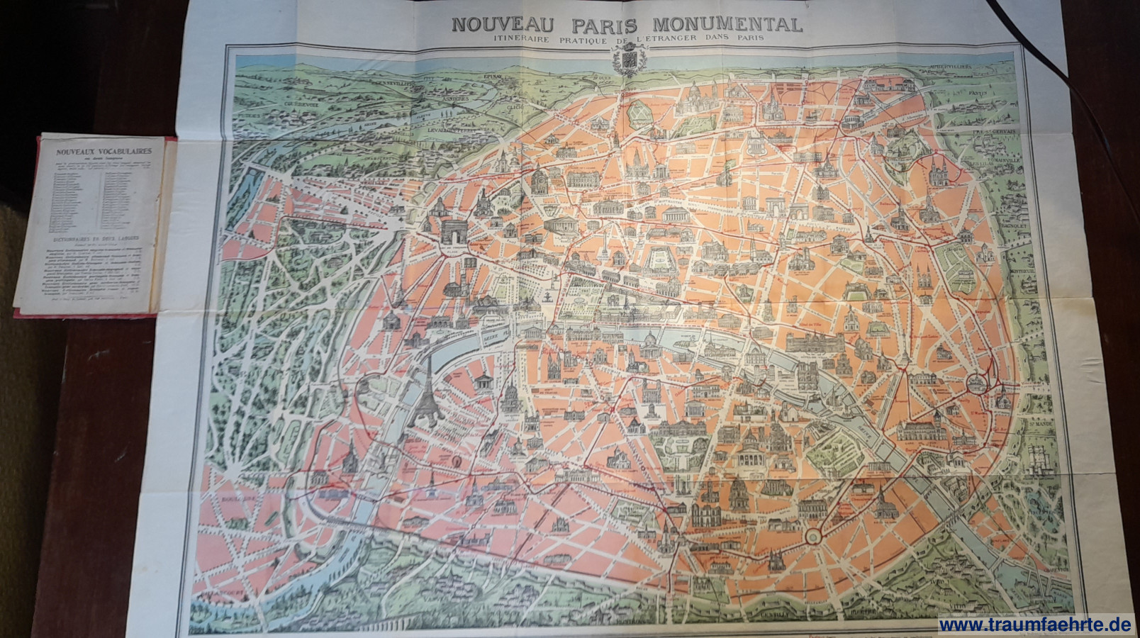Alte Bücher etc. > Orts- & Landeskunde > EuropaNouveau Paris Monumental (Stadtplan). [ Permalink ]>>> Artikel-Nr: 36386 <<< Paris, Garnier Freres ca. 1900, farbiger, ausklappbarer Stadtplan mit aufgedruckten Gebäuden ( 75 x 55 cm(, rückseitig farb. Umgebungskarte mit aufgedruckten Sehenswürdigkeiten, in silbergeprägter OLn.-Mappe, 7 Blatt Erklärungen in französischer Sprache Zustand: ordentliches Exemplar Preis: 25,00 €