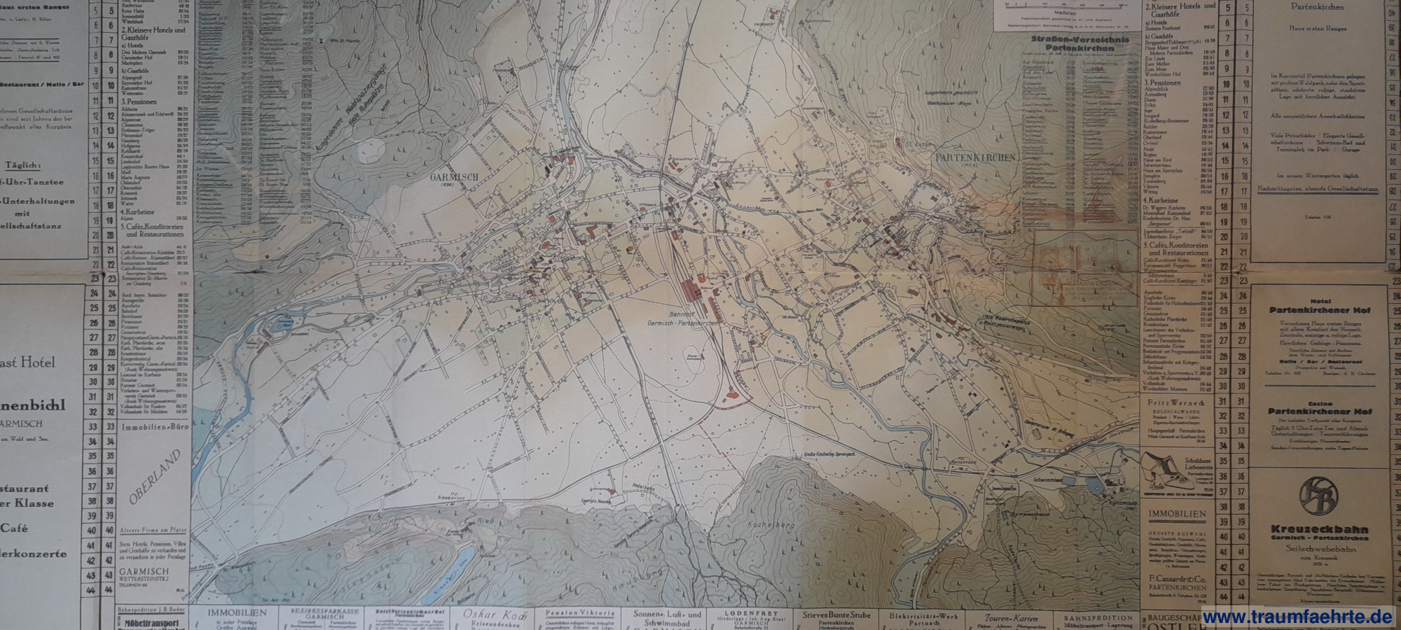 Alte Bücher etc. > Landkarten > Stadtpläne & Atlanten DeutschlandSanwald-Plan (Stadtplan) Garmisch-Partenkirchen. [ Permalink ]>>> Artikel-Nr: 36394 <<< Garmisch ca. 1935, farb. ausklappbarer Plan ( 98 x 52 cm), am Rand regionale Werbung, Orts- und Strassenregister, rückseitig: farb. Karte der Umgebung Zustand: an den Pfalzstellen etwas eingerissen, Name auf Umschlag, Eckknick Preis: 38,00 €