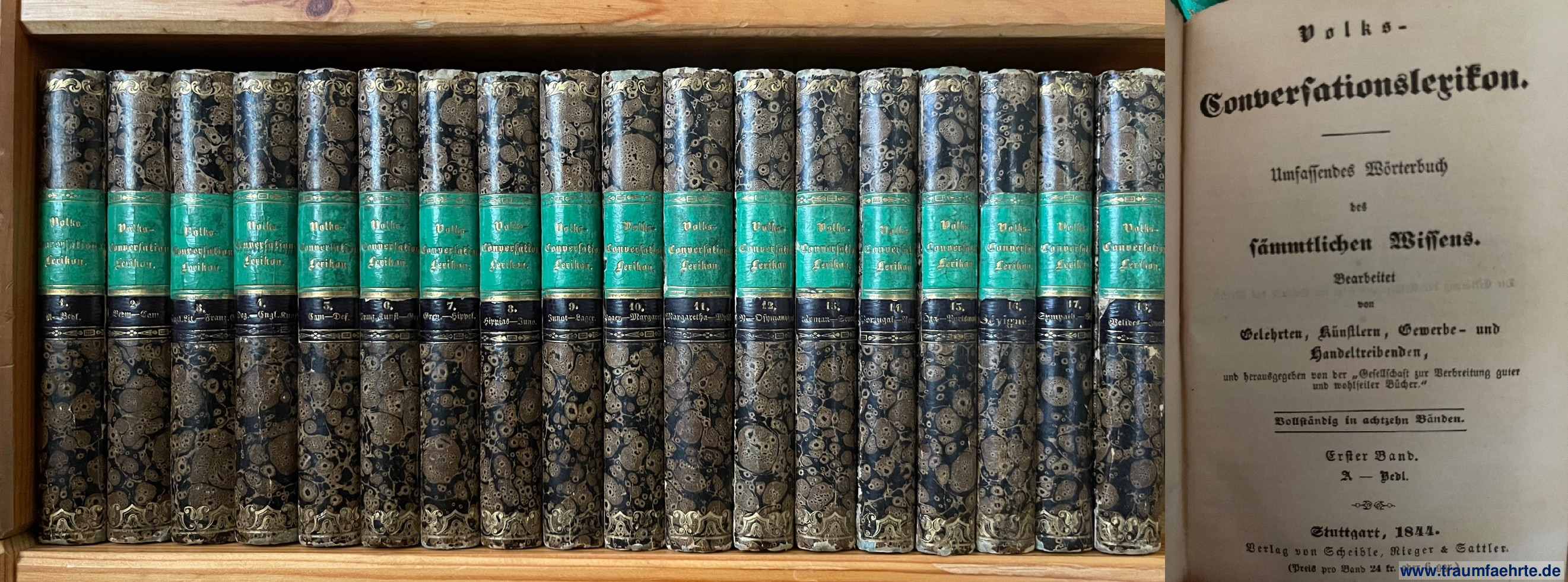 Alte Bücher etc. > Nachschlagewerke > LexikaAutorenkollektiv: Volks-Conversationslexikon. Umfassendes Wörterbuch des sämmtlichen Wissens. 18 Bände (so komplett). [ Permalink ]>>> Artikel-Nr: 36467 <<< Stuttgart, Rieger 1844–1846, zusammen ca. 6300 S., marmorierte Orig.-Pappbände mit montierten Rückenschildern, Klein-8° Zustand: Einbandkanten etwas berieben, insgesamt schöne Bände Preis: 340,00 €