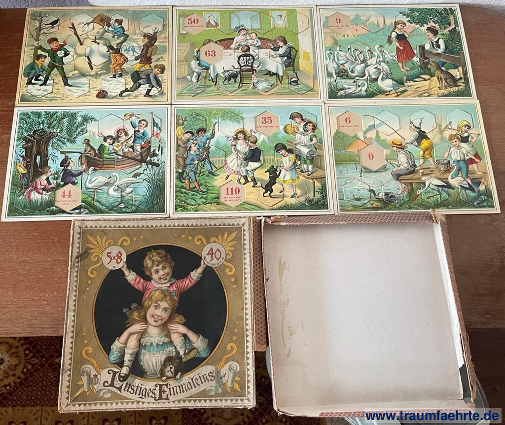 Alte Bücher etc. > Kinderbücher > Spielkarten & Spiele5 x 8 ist 40. Wer's nicht glaubt, der irrt sich. Lustiges Einmaleins. [ Permalink ]>>> Artikel-Nr: 36550 <<< Anonym ca. 1890 (Verlagsnummer 4131), 6 chromolithographische Bilder (Vorlagen) mit je 11 ausgestanzten Bildern zum Einlegen (wie beim Puzzle, rückseitig steht die Rechenaufgabe und passt zum Ergebnis), alles in goldgeprägter, farb. Illustr. Orig.-Pappschachtel, 4° Zustand: von den 66 ausgestanzten Teilen fehlen 8 Stück, Pappschachtel beschädigt Preis: 48,00 €