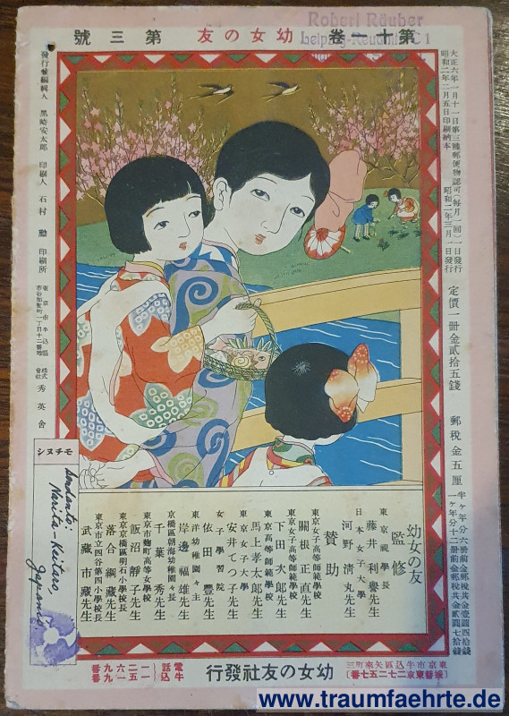 Alte Bücher etc. > Kinderbücher > Comics & HumorJapanischer Comic. 友の女幼, 巻一第十 [ Permalink ]>>> Artikel-Nr: 38814 <<< 行發社 (kōhatsu sha), ca. 1925, Band 1, Ausgabe 10 von 友の女幼 (tomo no onna osana), farb. illust. 8 Blatt (tlw. nochmal ausklappbar), farb. Illustr. OBro., in (japanischer) Sprache Zustand: Namenstempel auf Umschlag, etwas berieben Preis: 140,00 €