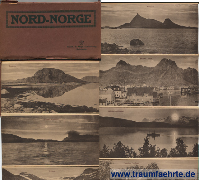 Alte Bücher etc. > Orts- & Landeskunde > EuropaNord-Norge [ Permalink ]>>> Artikel-Nr: 39056 <<< Kristiania, Oppi ca. 1930, ausklappbares Leporello von zehn Postkartenansichten in Übergröße: 1. Torghalten, 2. Midnatsol, Rödölöven, 3. Svartisen, 4. De syv Söstre, 5. Fiskeflaate, Lofoten (Fischfangflotte), 6. Hestmandö, 7. Svolvær, Lofoten, 8. Midnatsol ved Harstad, 9. Finmarken, Fjeldlapper (Samen in traditioneller Bekleidung vor ihrem Zelt), 10. Nordkap Zustand: Umschlag berieben Preis: 48,00 €