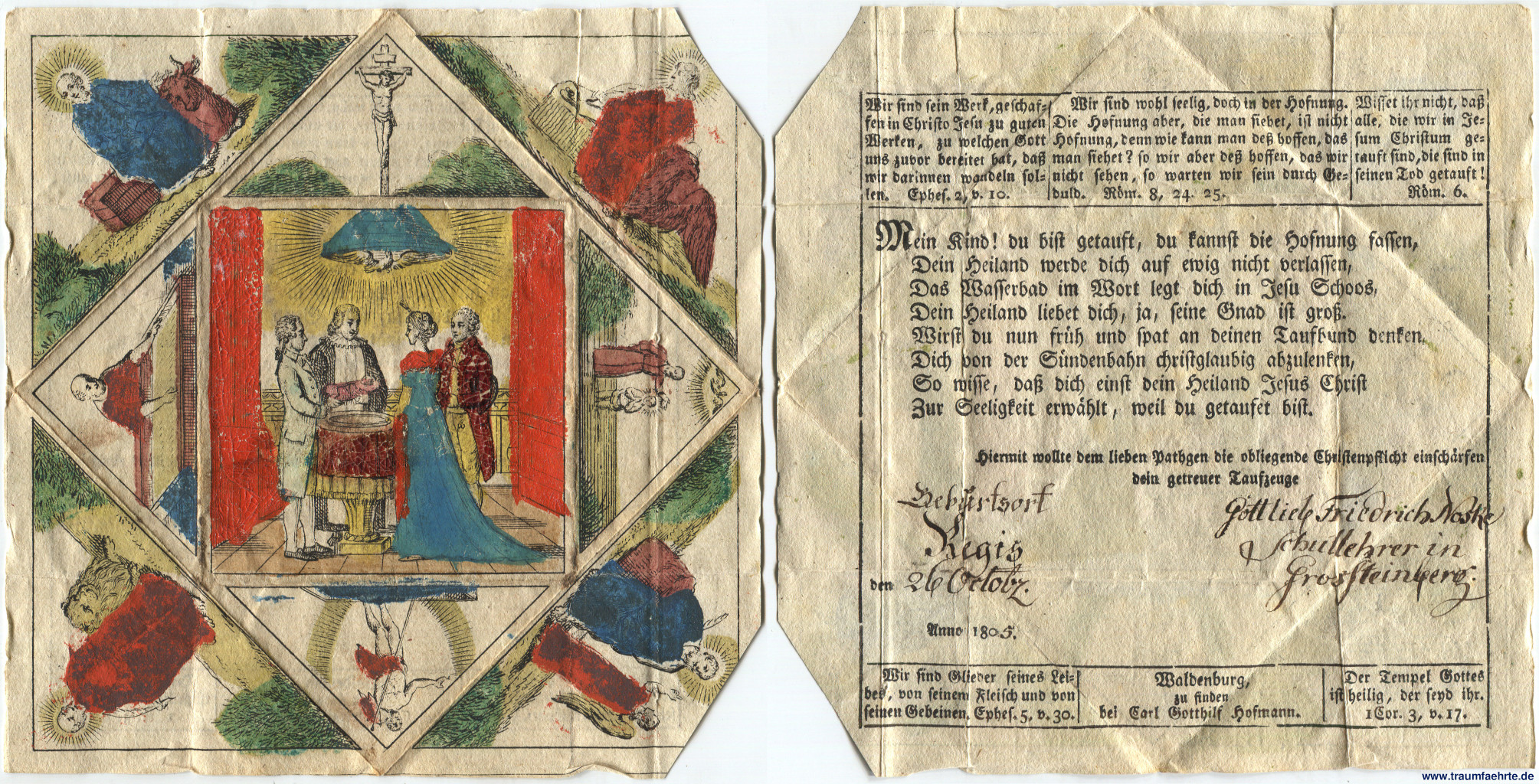 Alte Bücher etc. > Religion > ChristentumTaufbrief Anno 1805. [ Permalink ]>>> Artikel-Nr: 39061 <<< Großsteinberg 1805, handcolorierter Kupferstich, rückseitig mit Bibelsprüchen und Tuscheeintragung des Tauftages, ca. 15 x 15 cm Zustand: übliche Faltungen Preis: 90,00 €